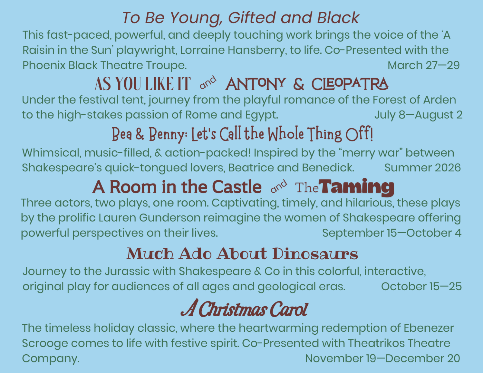 Much Ado About Dinosaurs: Journey to the Jurassic with Shakespeare & company in this colorful, interactive, original play for audiences of all ages and geological eras. October 15—25